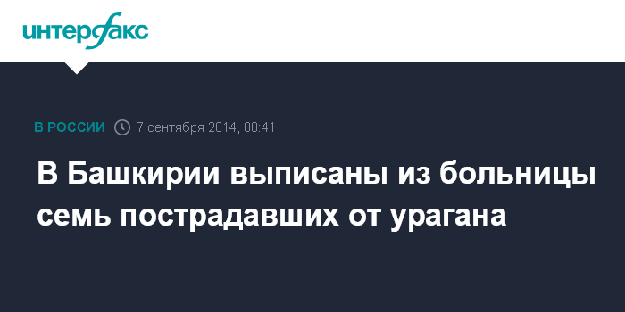 Москва. 7 сентября. INTERFAX.RU - Семеро из пятнадцати госпитализированных в результате урагана в Башкирии выписаны из больниц, сообщили "Интерфаксу" в ГУ МЧС по республике в воскресенье.