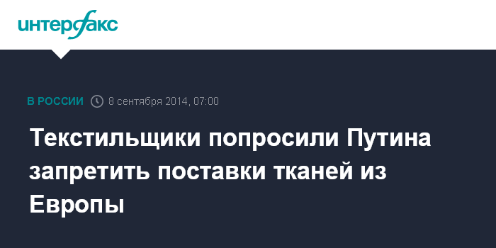 Москва. 8 сентября. INTERFAX.RU - Производители тканей просят российские власти запретить поставки европейской текстильной продукции. Об этом пишут "Известия" со ссылкой на копию письма главы Ассоциации текстильщиков России (АТР) Шамхала Ильдарова президенту РФ Владимиру Путину.