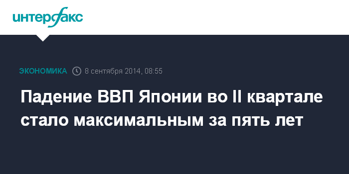 Москва. 8 сентября. INTERFAX.RU - Оценка снижения ВВП Японии во втором квартале 2014 года пересмотрена в худшую сторону - до 7,1% в годовом выражении, свидетельствуют окончательные данные. Падение ВВП стало максимальным с первого квартала 2009 года.