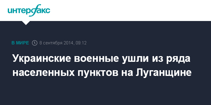 Москва. 8 сентября. INTERFAX.RU - Украинская армия вывела свои подразделения из ряда населенных пунктов в Луганской области, сообщает в понедельник агентство "Новороссия".