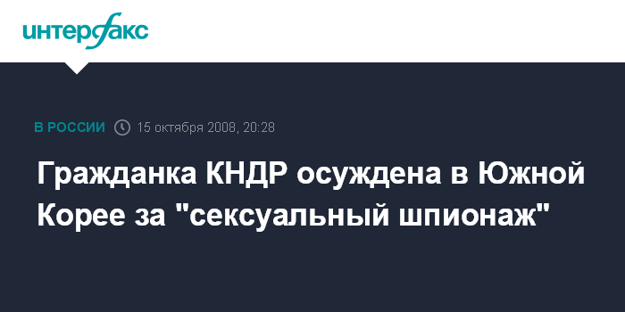 Москва. 15 октября. INTERFAX.RU - Южнокорейский суд приговорил гражданку КНДР к пяти годам тюрьмы по обвинению в "сексуальном шпионаже", передает в среду телеканал CNN.