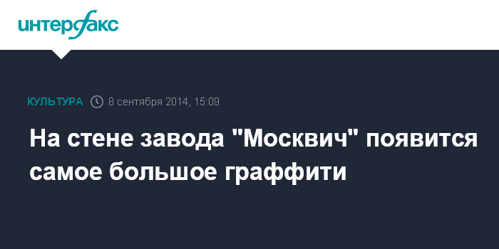 Москва. 8 сентября. INTERFAX.RU - На стене бывшего цеха автозавода "Москвич", который находится недалеко от станции метро "Текстильщики", появится самое большое граффити России, сообщила "Интерфаксу" замдиректора по маркетингу и коммуникациям технополиса "Москва" Дарья Гусева.