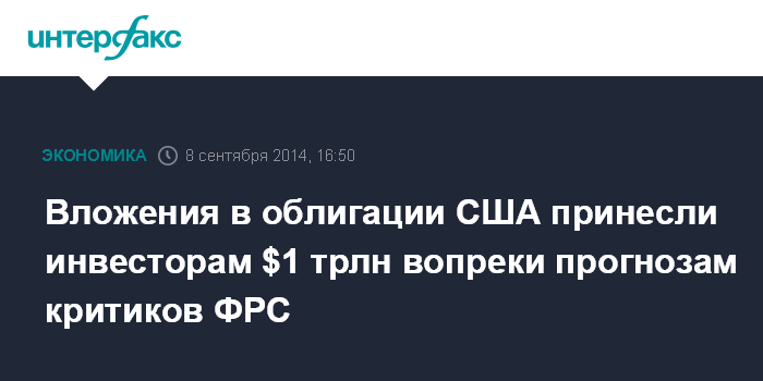Москва. 8 сентября. INTERFAX.RU - Инвесторы, продолжавшие вкладываться в казначейские бумаги США, не слушая ученых, миллиардеров и политиков, которые критиковали денежно-кредитную политику Федеральной резервной системы (ФРС) в период после начала финансового кризиса, заработали с конца 2008 года $1 трлн, пишет агентство Bloomberg.