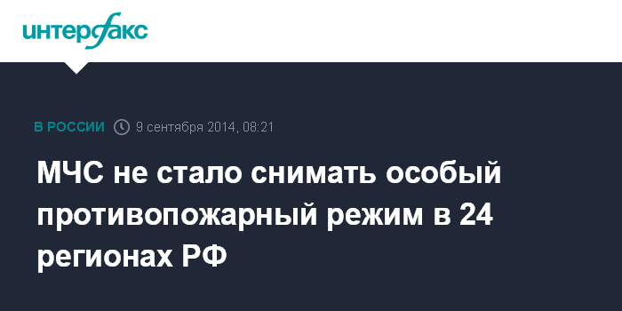 Москва. 9 сентября. INTERFAX.RU - В 24 российских регионах действует особый противопожарный режим, ограничивавший посещение лесов, сообщил во вторник журналистам официальный представитель МЧС Александр Дробышевский.