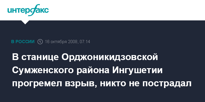Москва. 16 октября. ИНТЕРФАКС - Неустановленное взрывное устройство сработало в станице Орджоникидзовская Сумженского района Ингушетии, жертв и пострадавших нет.