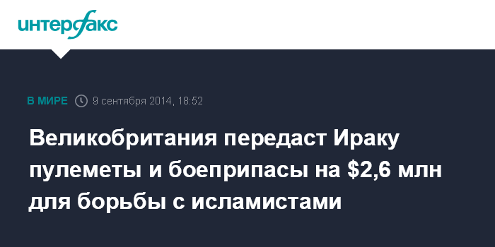 Москва. 9 сентября. INTERFAX.RU - Власти Великобритании приняли решение передать Ираку партию крупнокалиберных пулеметов и боеприпасов на общую сумму в 1,6 млн фунтов стерлингов (почти $2,6 млн). Об этом сообщил во вторник британский министр обороны Майкл Фэллон. Министр пояснил, что затраты на доставку этой военной помощи в Ирак составят 474 тыс. фунтов (более $760).
