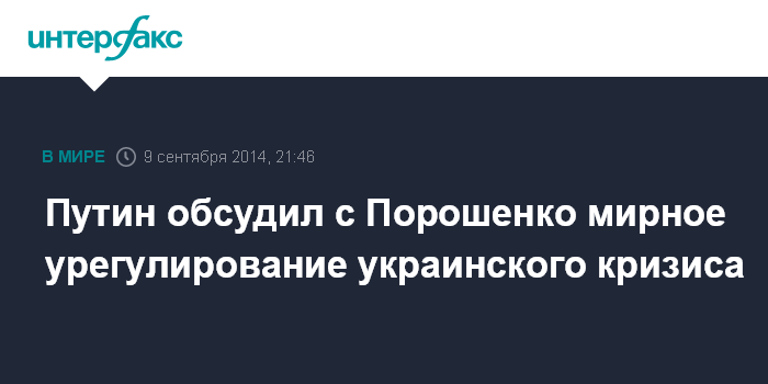 Москва. 9 сентября. INTERFAX.RU - Состоялся телефонный разговор президентов России и Украины Владимира Путина и Петра Порошенко, в ходе которого "была акцентирована важность обеспечения сторонами внутриукраинского конфликта устойчивого режима прекращения огня на Юго-Востоке страны", сообщает пресс-служба Кремля.