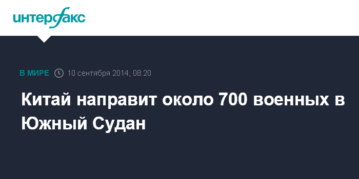 Москва. 10 сентября. INTERFAX.RU - Китай направит батальон сухопутных войск вооруженных сил численностью около 700 человек в состав миротворческой миссии ООН в Южном Судане, сообщила газета The Wall Street Journal.