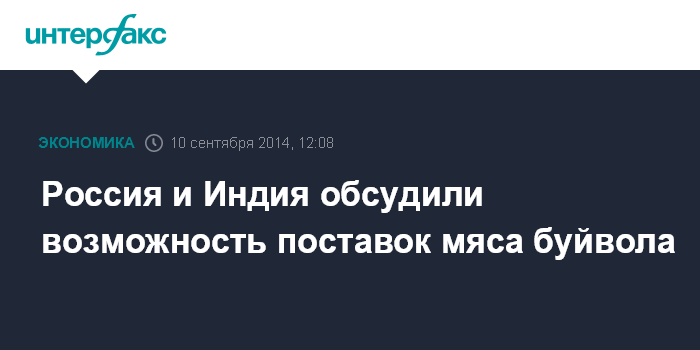 Москва. 10 сентября. INTERFAX.RU - Россия рассматривает возможность импорта мяса буйволов из Индии, сообщил Россельхознадзор. Речь об этом шла на переговорах между представителями российской службы и посольства Индии в Москве.