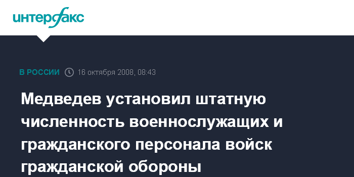 "Установить с 1 сентября 2008 года штатную численность военнослужащих войск гражданской обороны в количестве 18,25 тыс. единиц. Правительству РФ в трехмесячный срок установить штатную численность гражданского персонала войск гражданской обороны, предусмотрев ее увеличение на 1,2 тыс. единиц", - отмечается в размещенном на сайте президента РФ тексте указа.