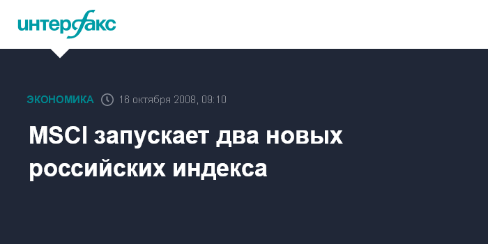 Москва. 16 октября. INTERFAX.RU - Индексная компания MSCI Barra с 20 октября в дополнение к основному российскому инструменту MSCI Russia Index запускает два новых - MSCI Russia ADR/GDR Index и MSCI Russia Alternative Listing Index.