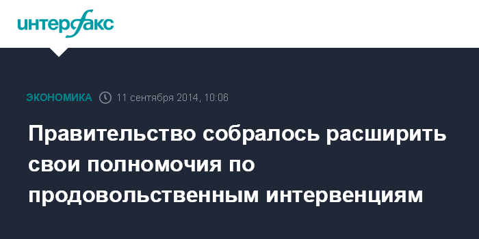 Москва. 11 сентября. INTERFAX.RU - Правительство РФ на заседании в четверг планирует рассмотреть законопроект, который предусматривает расширение его полномочий по установлению порядка и условий продовольственных интервенций.