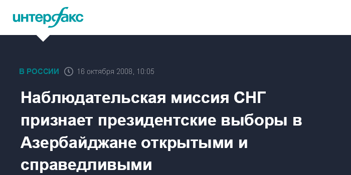 Москва. 16 октября. INTERFAX.RU - Миссия СНГ по наблюдения за президентскими выборами в Азербайджане признает их открытыми, справедливыми и транспарентными.