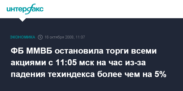 Москва. 16 октября. INTERFAX.RU - Фондовая биржа ММВБ остановила в четверг торги всеми акциями с 11:05 МСК на час из-за падения технического индекса биржи более чем на 5% к уровню закрытия предыдущего дня, сообщила биржа.