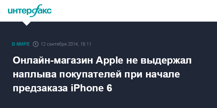 Москва. 12 сентября. INTERFAX.RU - Американская версия онлайн-магазина компании Apple в ночь на пятницу была недоступна на протяжении 2 часов 25 минут из-за неполадок с серверами, вызванными чрезмерным количеством желающих оформить предзаказ на iPhobe 6 и iPhone 6 Plus, сообщает онлайн-издание the Verge.