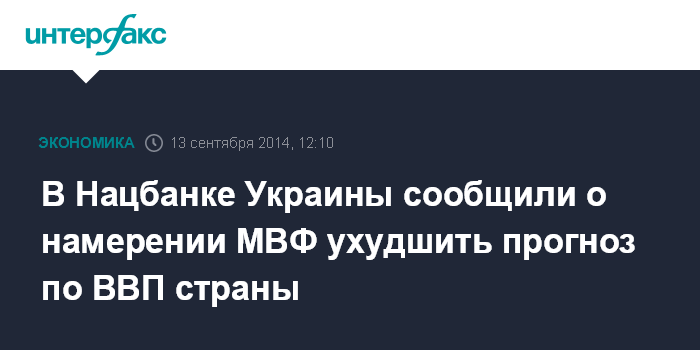 Москва. 13 сентября. INTERFAX.RU - Эксперты Международного валютного фонда (МВФ) ухудшили прогноз падения валового внутреннего продукта (ВВП) Украины в 2014 году с последнего согласованного значения в 6,5%, сообщила глава Национального банка Украины (НБУ) Валерия Гонтарева. "Несколько дней назад вела переговоры с экспертами МВФ. Их прогнозы ухудшились. Не могу сказать, каким будет к концу года, но больше, чем 6,5%", - сказала она на 11-м форуме YES в Киеве в субботу.