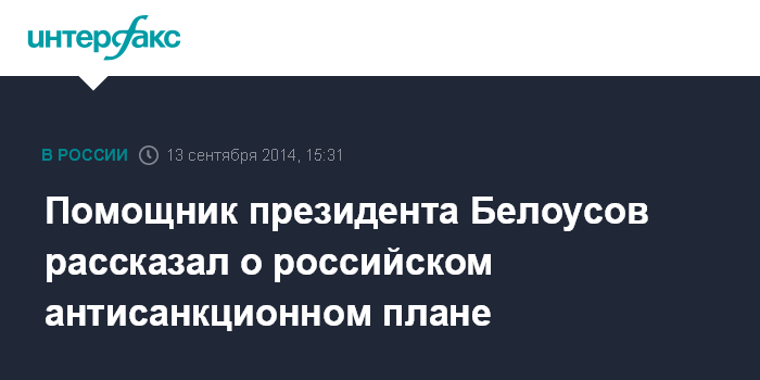 Москва. 13 сентября. INTERFAX.RU - Россия разработала ответный антисанкционный план, который предусматривает разные меры - от самых мягких до самых жестких, заявил помощник президента Андрей Белоусов.