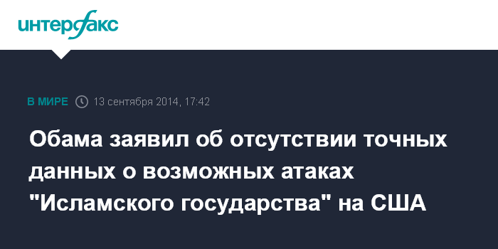 Москва. 13 сентября. INTERFAX.RU - Американская разведка до сих пор не располагает достоверными сведениями о том, что боевики из радикальной группировки "Исламское государство" (ИГ) представляют реальную угрозу национальной безопасности США, заявил в субботу президент США Барак Обама. "Наше разведывательное сообщество пока не установило наличие у "Исламского государства" конкретных планов против США", - сказал он в ходе еженедельного обращения к нации.