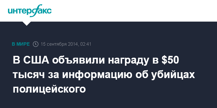 Москва. 15 сентября. INTERFAX.RU - В воскресенье некоммерческая организация Pennsylvania Crime Stoppers объявила награду в $50 тысяч за информацию, которая поможет выследить и задержать виновных в смерти полицейского в городе Блуминг Гров. В свою очередь, полиция штата Пеньсильвания обещает за информацию $20 тысяч, сообщил телеканал CNN.