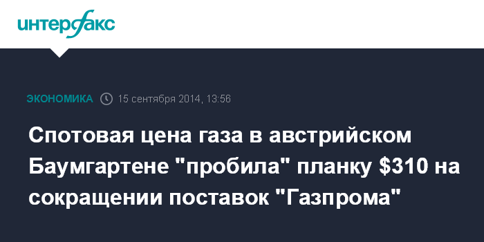 Москва. 15 сентября. INTERFAX.RU - Цена газа в ближайшем к России спотовом хабе в австрийском Баумгартене за последние сорок дней выросла на треть - на торгах с поставкой во вторник, 16 сентября, уже "пробила" отметку $310 за тысячу кубометров.