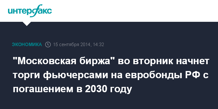 Москва. 15 сентября. INTERFAX.RU - Московская биржа 16 сентября начинает торги фьючерсами на еврооблигации Российской Федерации с погашением в 2030 году ("Россия-2030"), сообщается в пресс-релизе биржи.