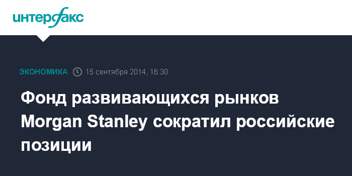 Москва. 15 сентября. INTERFAX.RU - Morgan Stanley Emerging Markets Fund во втором квартале сократил российские позиции в своем портфеле из-за геополитических рисков.