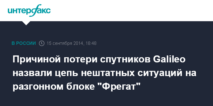 Москва. 15 сентября. INTERFAX.RU - Отказ разгонного блока "Фрегат-МТ", который не смог в конце августа вывести европейские космические навигационные аппараты Galileo на расчетную орбиту, носил комплексный характер, сообщил "Интерфаксу" источник в ракетно-космической отрасли.