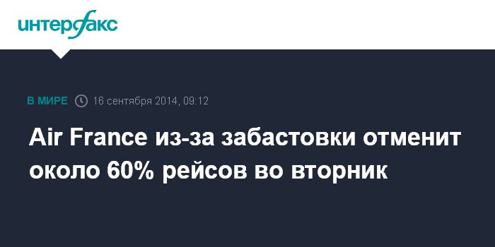 Москва. 16 сентября. INTERFAX.RU - Французская авиакомпания Air France во вторник планирует отменить примерно 60% рейсов из-за масштабной забастовки пилотов, сообщает сайт парижской газеты Le Figaro.