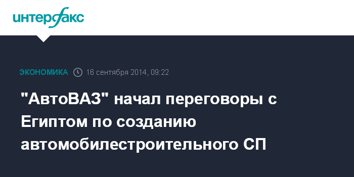 Москва. 16 сентября. INTERFAX.RU - "АвтоВАЗ" ведет переговоры с египетскими властями об организации совместного предприятия по производству автомобилей, сообщил "Интерфаксу" представитель компании. Одним из вариантов является создание СП с компанией Nasr с производством автомобилей по полному циклу.