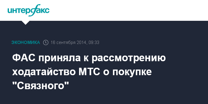 Москва. 16 сентября. INTERFAX.RU - ФАС приняла к рассмотрению ходатайство МТС о покупке группы компаний "Связной", говорится в сообщении ведомства. МТС также подала ходатайство на приобретение шести дочерних компаний "Связного" - "С-Клуб", "Связной логистика", "Связной Страхование", "Связной загрузка", "Мобильный Телекоммуникационный Сервис" и "Эксплей".