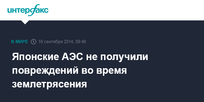 Москва. 16 сентября. INTERFAX.RU - Японские АЭС не пострадали во время произошедшего во вторник землетрясения, сообщили компании TEPCO и Japan Atomic Power.