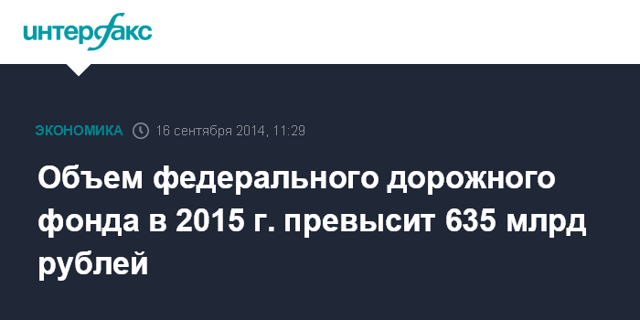 Москва. 16 сентября. INTERFAX.RU - Объем федерального дорожного фонда на 2015 год запланирован в размере 635,3 млрд рублей с учетом передачи трансферта в региональные фонды на сумму 91,2 млрд рублей. Такая информация содержится в материалах по основным параметрам бюджета на 2015-2017 годы к заседанию трехсторонней комиссии по регулированию социально-трудовых отношений.