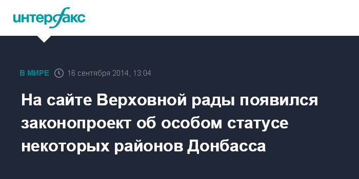 Москва. 16 сентября. INTERFAX.RU - В Верховной раде Украины зарегистрирован президентский законопроект о введении особого порядка самоуправления в отдельных районах Донецкой и Луганской областей сроком на три года, а также о проведении внеочередных местных выборов в этих регионах 7 декабря нынешнего года.