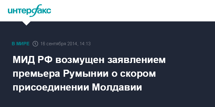 Москва. 16 сентября. INTERFAX.RU - МИД России назвал безответственными и неприемлемыми заявления премьер-министра Румынии Виктора Понта об объединении Молдавии с его страной к 2018 году и выразил надежду на соответствующую реакцию на эти высказывания в ЕС.