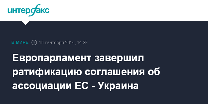 Москва. 16 сентября. INTERFAX.RU - Европейский парламент на пленарной сессии в Страсбурге во вторник завершил ратификацию соглашения об ассоциации ЕС - Украина.