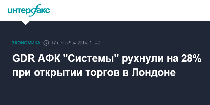 Москва. 17 сентября. INTERFAX.RU - GDR АФК "Системы" рухнули на 28% при открытии торгов на Лондонской бирже на новостях об аресте председателя совета директоров компании Владимира Евтушенкова.