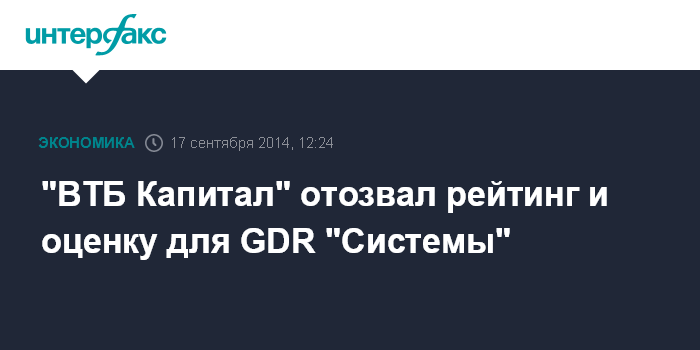 Москва. 17 сентября. INTERFAX.RU - "ВТБ Капитал" приостановил анализ АФК "Система", сообщается в обзоре инвестбанка. Все прежние оценки и рекомендации для глобальных депозитарных расписок (GDR) "Системы" от аналитиков "ВТБ Капитала" были отозваны.