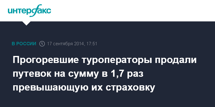 Москва. 17 сентября. INTERFAX.RU - Стоимость проданных путевок туроператорами РФ, приостановившими деятельность, в 1,7 раза превышает страховую сумму, следует из данных Всероссийского союза страховщиков (ВСС).