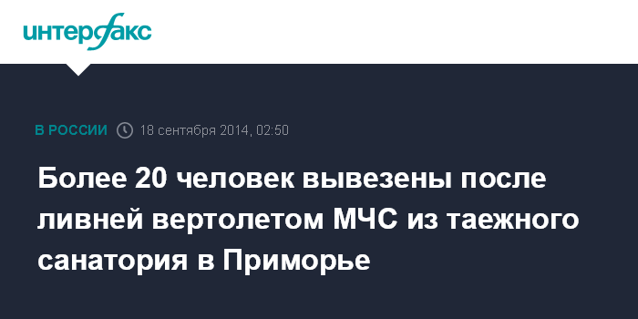 Москва. 18 сентября. INTERFAX.RU - Более 20 отдыхающих вывезены вертолетом Ми-8 Дальневосточного регионального центра МЧС из таежного санатория "Теплый ключ" Тернейского района Приморья, где накануне из-за ливней вышла из берегов река.
