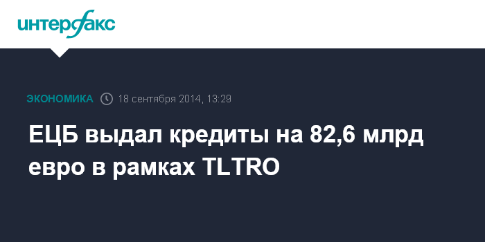 Москва. 18 сентября. INTERFAX.RU - Европейский центральный банк (ЕЦБ) предоставил банкам кредиты на сумму 82,6 млрд евро по итогам первого распределения средств в рамках программы целевого долгосрочного кредитования банков (TLTRO), сообщает агентство Bloomberg.