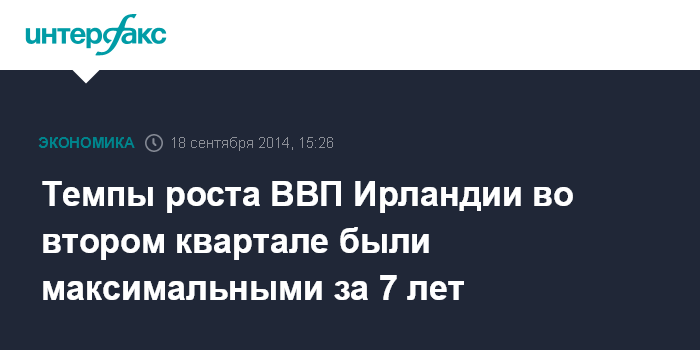 Согласно официальным данным, ВВП Ирландии в апреле-июне вырос на 7,7% в годовом выражении, что является самым существенным подъемом с первого квартала 2007 года. Увеличение ВВП по сравнению с первым кварталом текущего года составило 1,5%, рост зафиксирован второй квартал подряд.