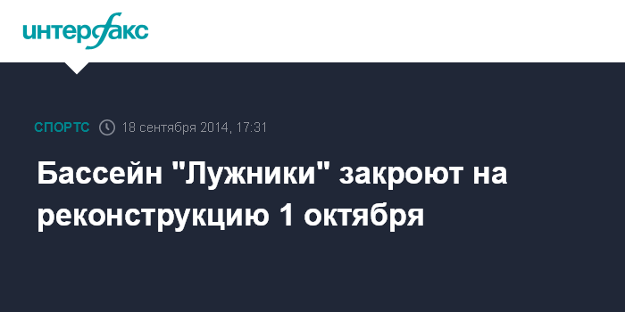 Москва. 18 сентября. INTERFAX.RU - Открытый плавательный бассейн олимпийского комплекса "Лужники" закрывается на реконструкцию с 1 октября. Об этом замдиректора по коммуникациям и продвижению ОАО "Лужники" Юлия Журкина сообщила в четверг в эфире радио "Москва FM".