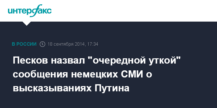 Москва. 18 сентября. INTERFAX.RU - Пресс-секретарь президента РФ Дмитрий Песков назвал "очередной уткой" информацию немецких СМИ о якобы резких высказываниях Владимира Путина в адрес ряда европейских столиц в одном из телефонных разговоров с президентом Украины Петром Порошенко.