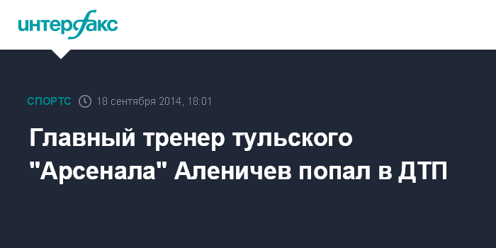 Москва. 18 сентября. INTERFAX.RU - Небольшое ДТП с участием машины главного тренера ПФК "Арсенал" Дмитрия Аленичева произошло в центре Тулы в четверг, сообщают тульские СМИ. За рулем находился сам экс-футболист.