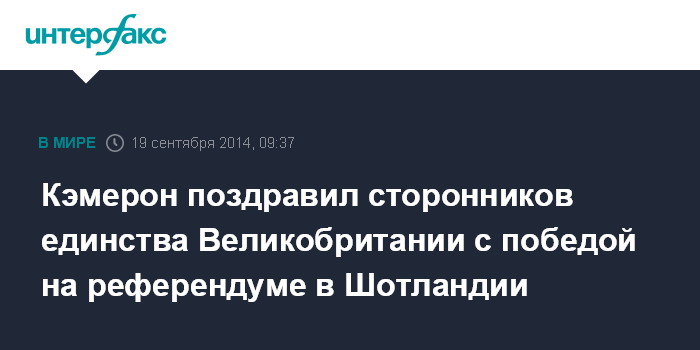 Москва. 19 сентября. INTERFAX.RU - Британский премьер-министр Дэвид Кэмерон в пятницу поздравил сторонников сохранения единства Великобритании с победой на прошедшем в Шотландии референдуме о независимости.