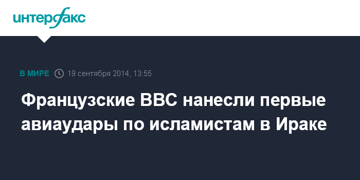 Москва. 19 сентября. INTERFAX.RU - Самолеты ВВС Франции нанесли первые удары по позициям боевиков из группировки "Исламское государство" (ИГ) в Ираке, говорится в распространенном в пятницу коммюнике Елисейского дворца.