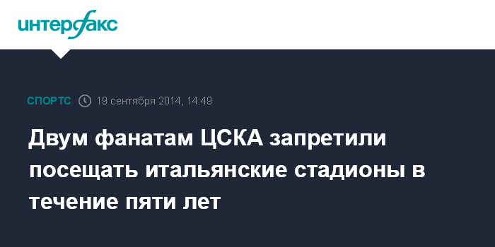 Москва. 19 сентября. INTERFAX.RU - Двум болельщикам футбольного клуба ЦСКА запрещено посещать итальянские стадионы в течение ближайших пяти лет, сообщает La Gazzetta dello Sport.