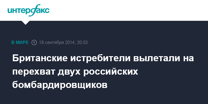 Москва. 19 сентября. INTERFAX.RU - Два истребителя "Тайфун" Королевских ВВС Великобритании, были подняты по тревоге с военной базы Лоссимаус в Шотландии на перехват двух российских стратегических бомбардировщиков Ту-95, сообщает в пятницу британская газета the Daily Mail.