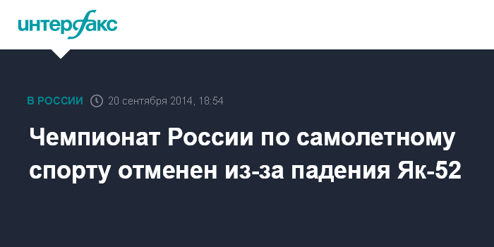 Москва. 20 сентября. INTERFAX.RU - Чемпионат России по пилотажу на самолетах Як-52, который должен был пройти с 22 по 28 сентября на аэродроме "Калачёво" в Челябинске, отменен из-за падения самолета во время тренировки, сообщается на сайте Федерации самолетного спорта России.