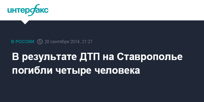 Москва. 20 сентября. INTERFAX.RU - В результате встречного столкновения автомобилей на Ставрополье погибли четыре человека. Об этом сообщает отдел пропаганды безопасности дорожного движения УГИБДД региона.